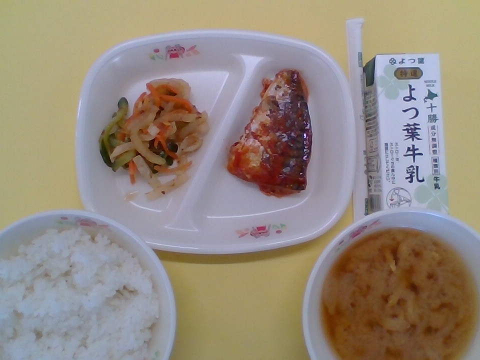 今日は和食の給食でした。「さばトマトに」はソースをごはんにかけて