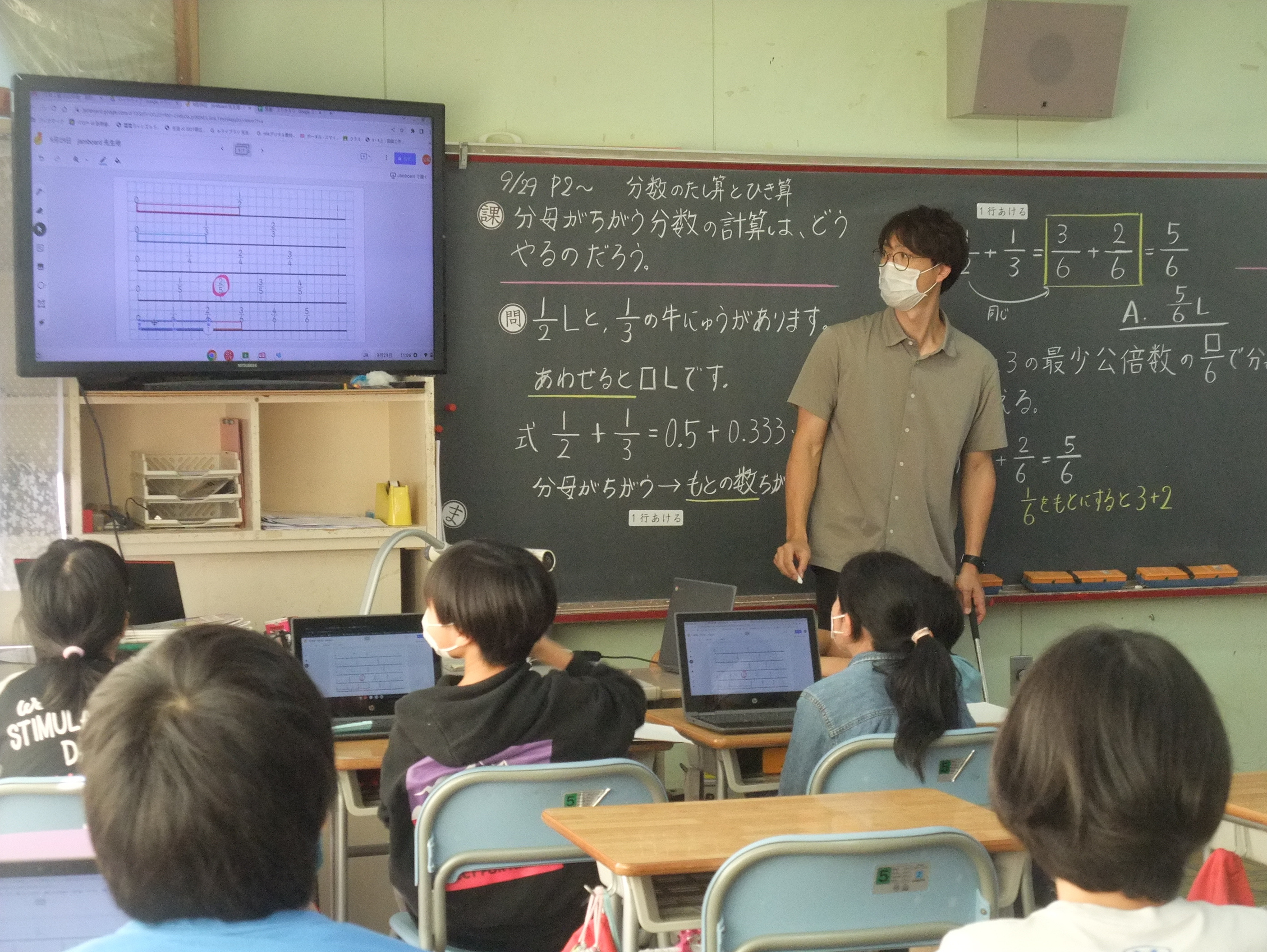 先日は,5年1組で算数「分数のたし算とひき算」の授業があり,高学年の先生方が参観をしました。ジャムボードを使って等しい大きさの分数を探したり,近くの友達と自分の考えを伝え合ったり,生き生きと活動する子どもたちの姿が見られました。