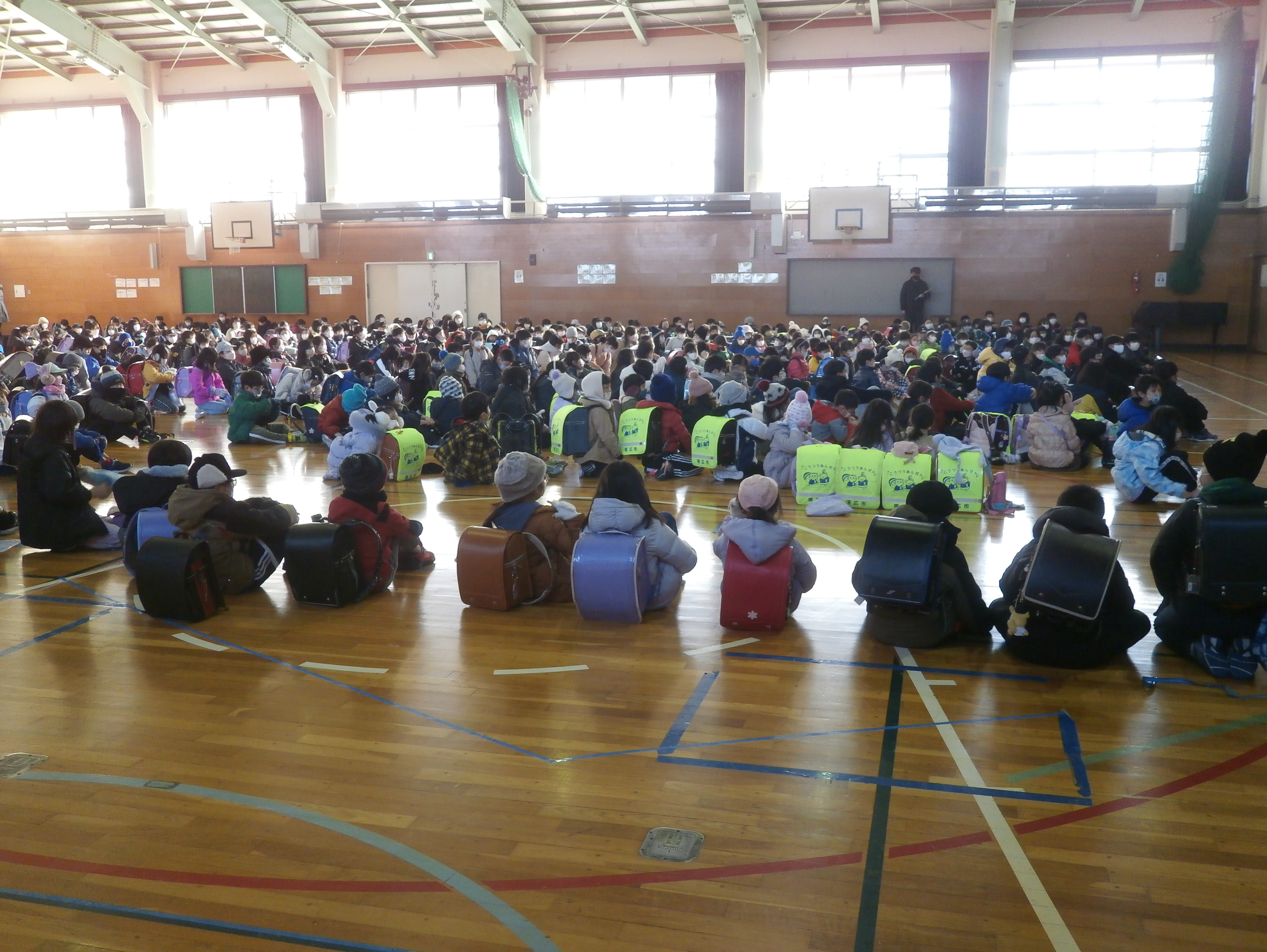 雪が舞う中、集団下校訓練が行われました。6年生が中心となり、各コースごとに整列や人数確認を行いました。最高学年として頼もしい姿を見ることができました。下校の際には、もしもの災害に備えて、緊張感をもちながら安全に下校することができました。