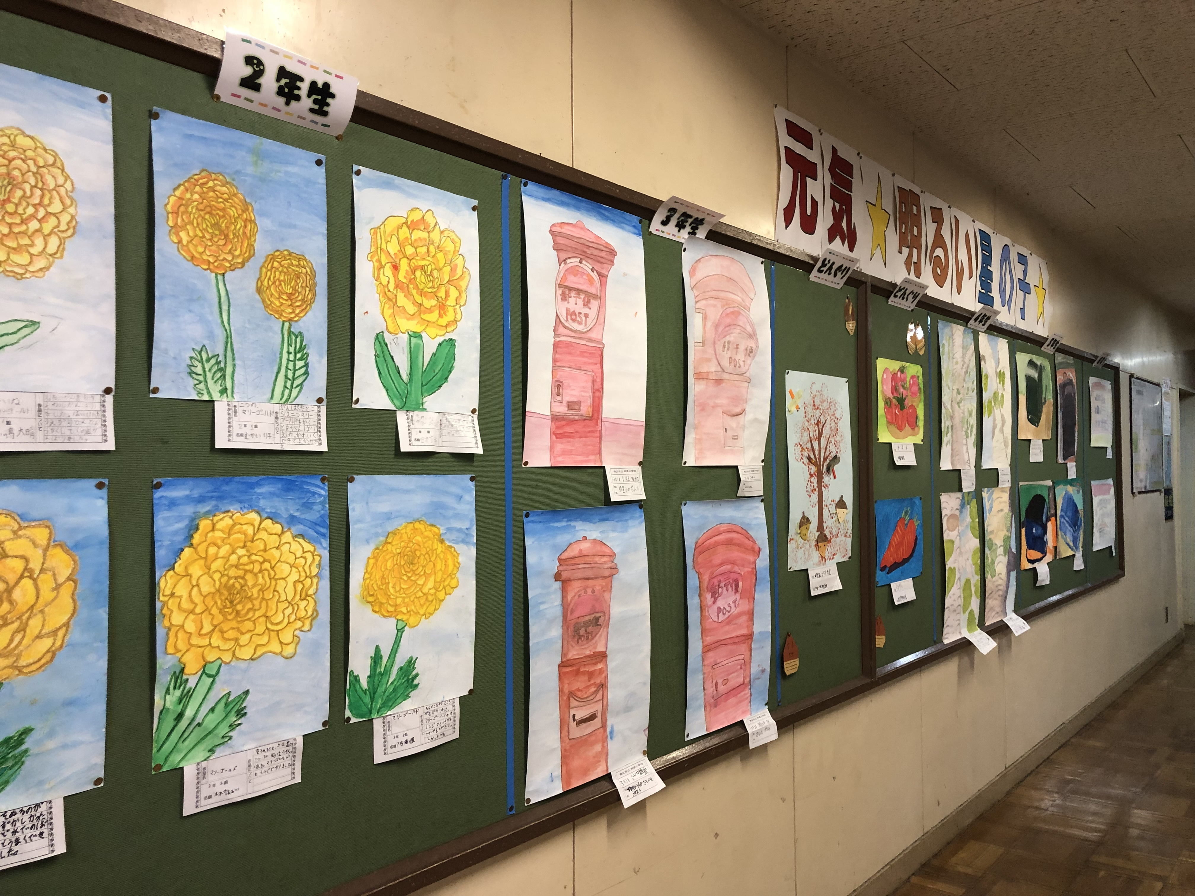 10月23日(月)から12月15日(金),校内において全児童の絵画展を実施しました。各学年の絵の題材は,1年生「とうもろこし」,2年生「マリーゴールド」,3年生「ポスト」,4年生「白樺」,5年生「ランドセル」,6年生「校舎」,どんぐり「野菜」です。子ども達が互いに鑑賞しあう中で,絵を描く向上心を高めることができました。