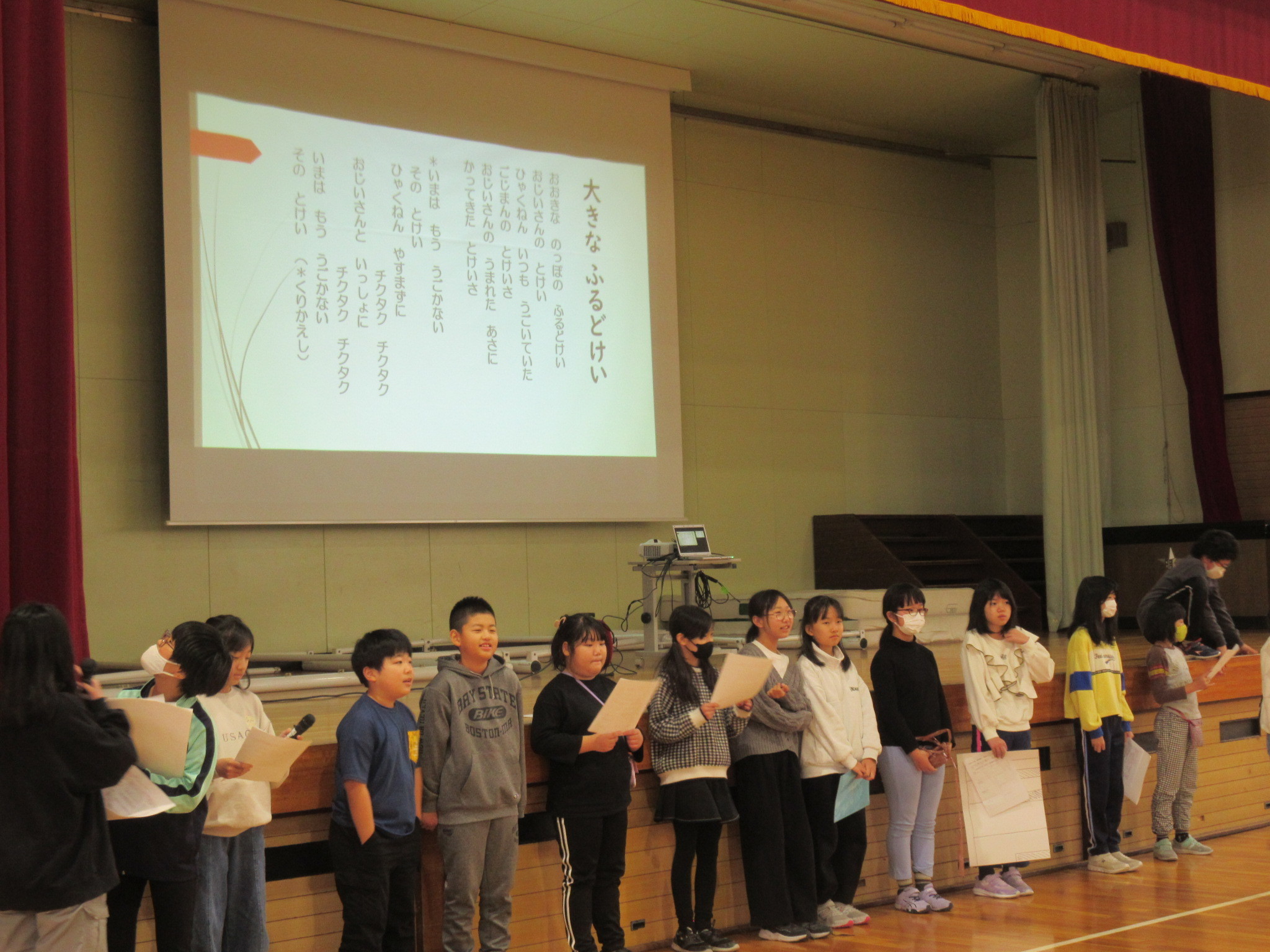 児童会の音楽委員会による今年2回目の音楽集会が開かれました。校舎1階にある振り子時計にちなみ、今回は「大きな古時計」を合唱し、体育館に星の子の素敵な歌声が響きました。合唱の後には音楽に関連する〇×クイズもあり、参加した児童はこれまで学習したことを思い出しながらクイズを楽しみました。