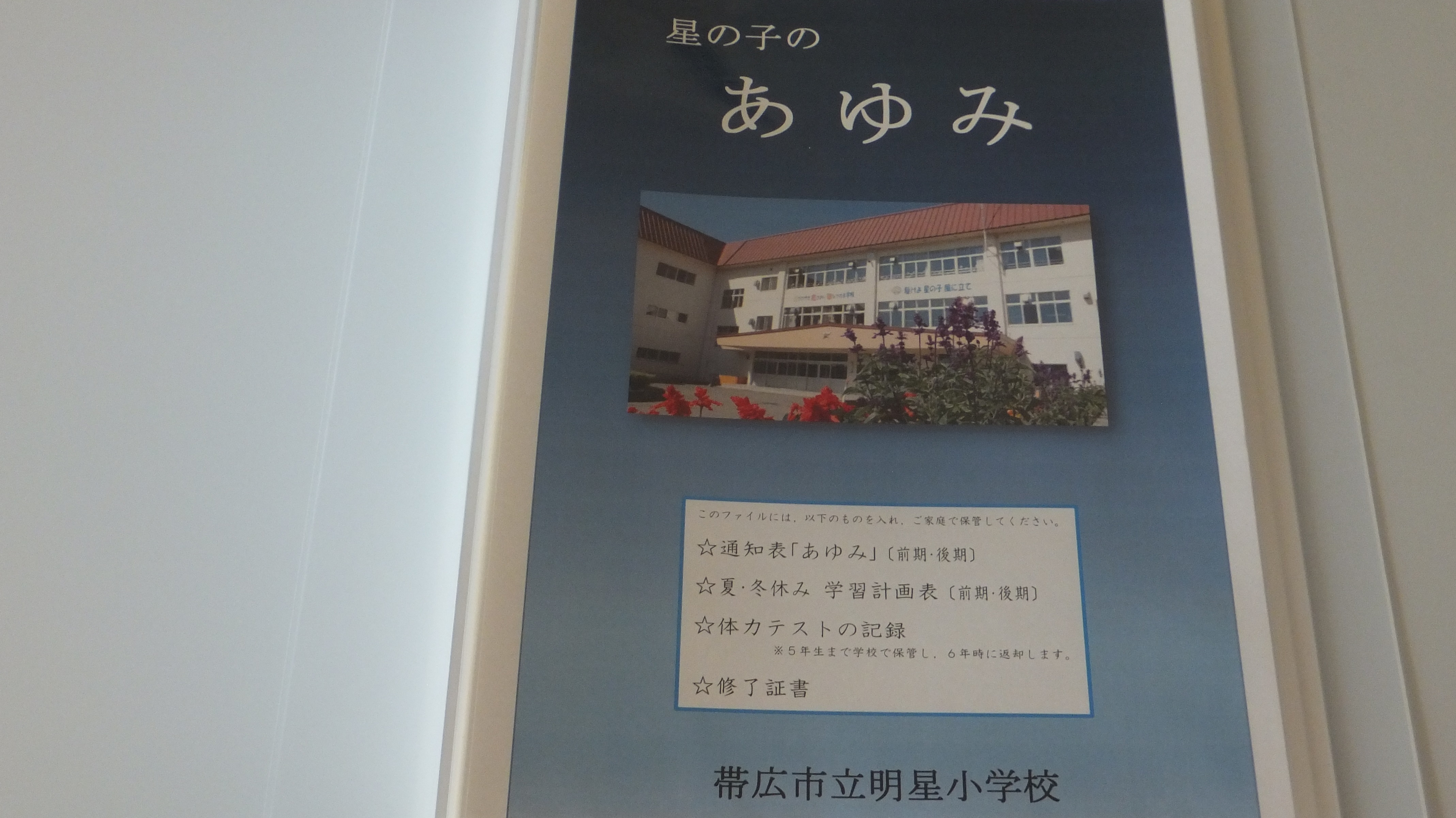 成績表の他,テスト等の記録,修了証書等をクリアブックに入れます。子ども一人一人の“6年間の学びの記録”として,ご家庭で大切に保管してください。