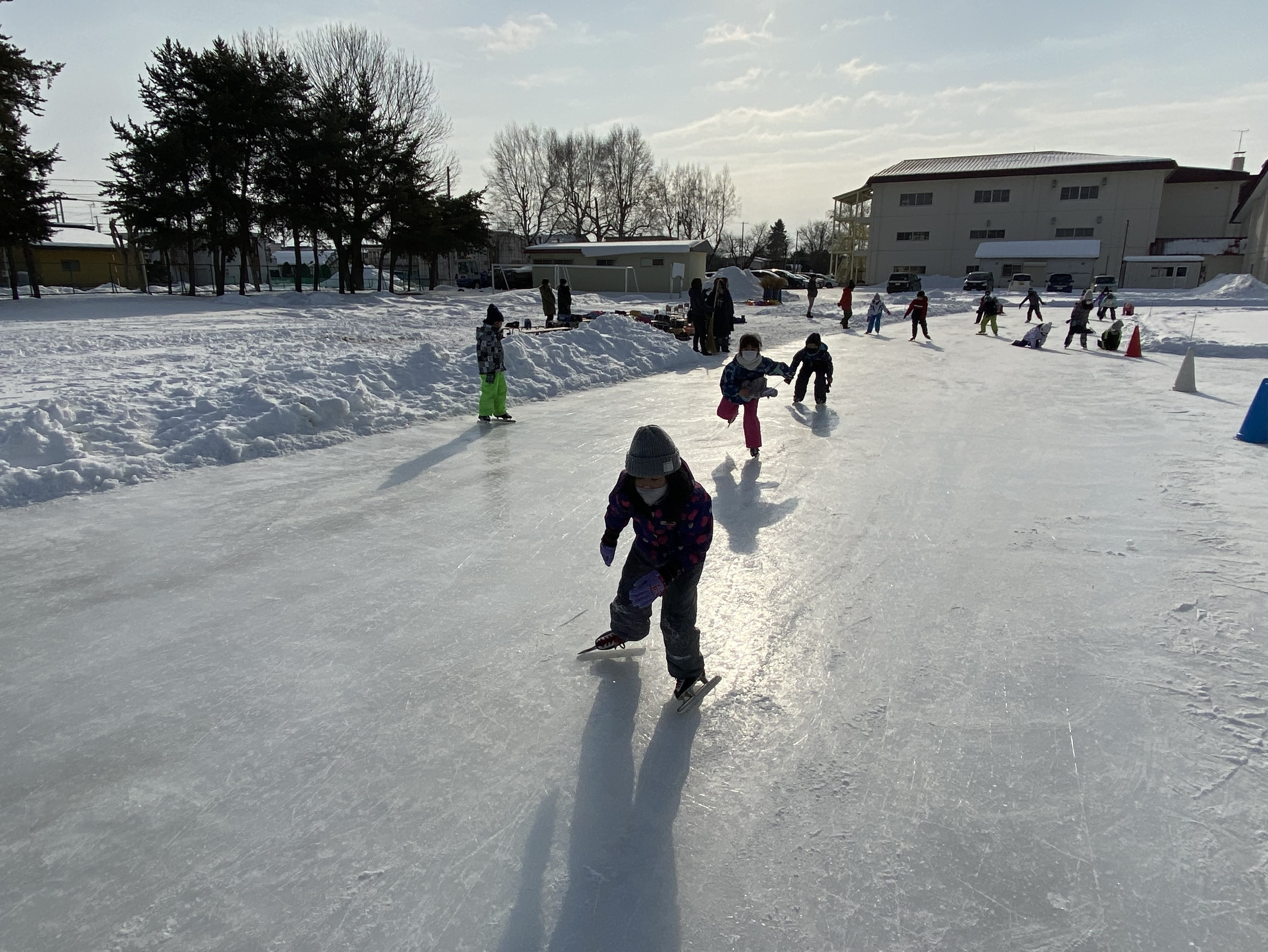 1月25日にスケートリンクが完成し、スケート学習が始まりました。例年よりも完成が遅くなってしまったこともあり、待ち遠しく感じていた子どもたちも多くいたと思います。天候によってリンクの状態が悪くなる日もありますが、そんな状況にも負けずに楽しそうにスケートをする姿が見られます。