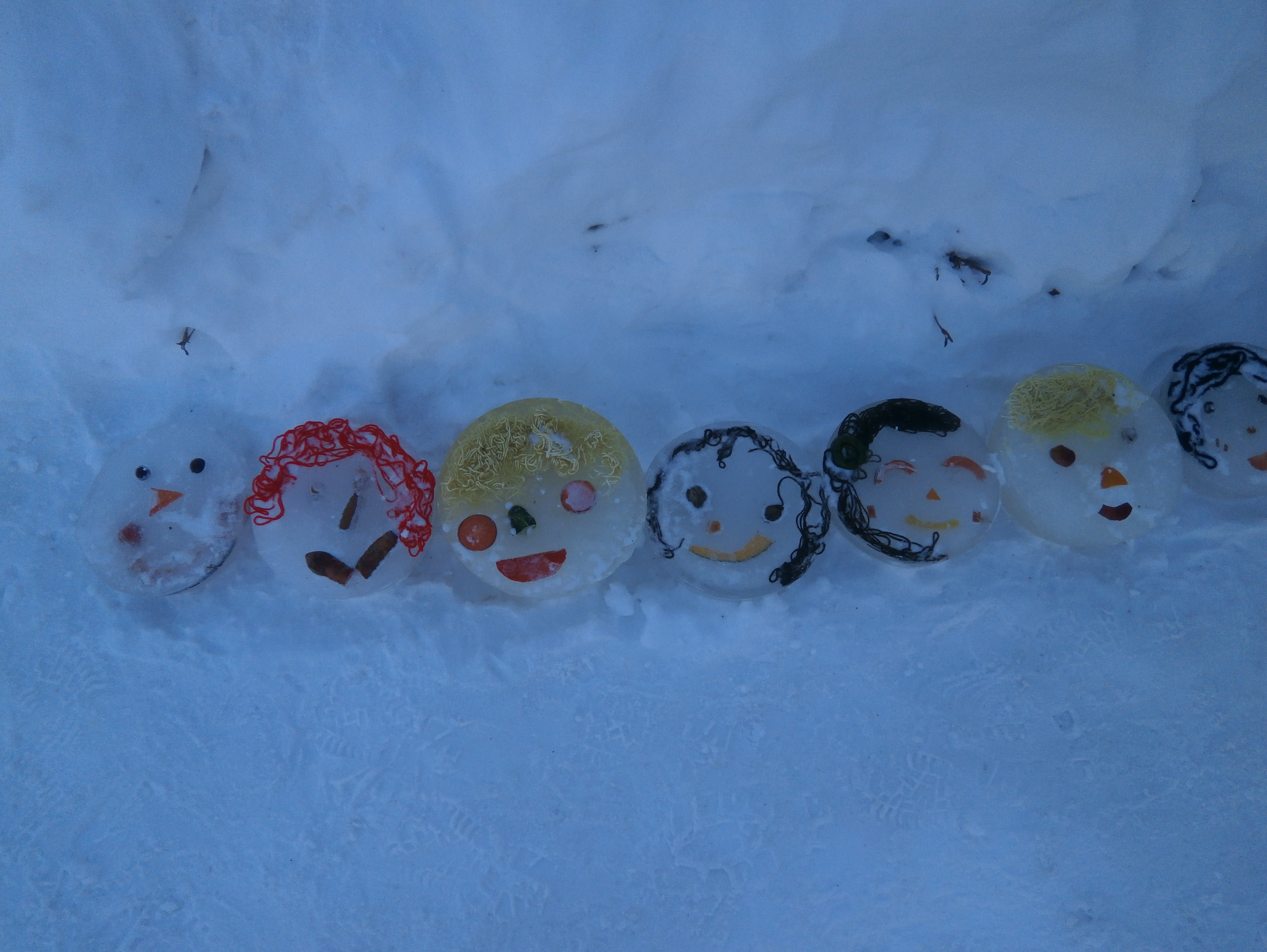 帯広の小学校の冬の風物詩「氷のお面」が、今年も完成しました。いつもなら、帯広氷まつりの会場に飾られるのですが、今年はコロナの影響でお祭りの規模が縮小されたため、飾ることができませんでした。そこで、今年は児童玄関前にある丸い花壇のところに飾り、登下校の子ども達や授業参観で来校された保護者の皆様の目を楽しませてくれました。一つ一つお面の表情が違います。それは作った子どもたち一人一人の個性そのものです。
