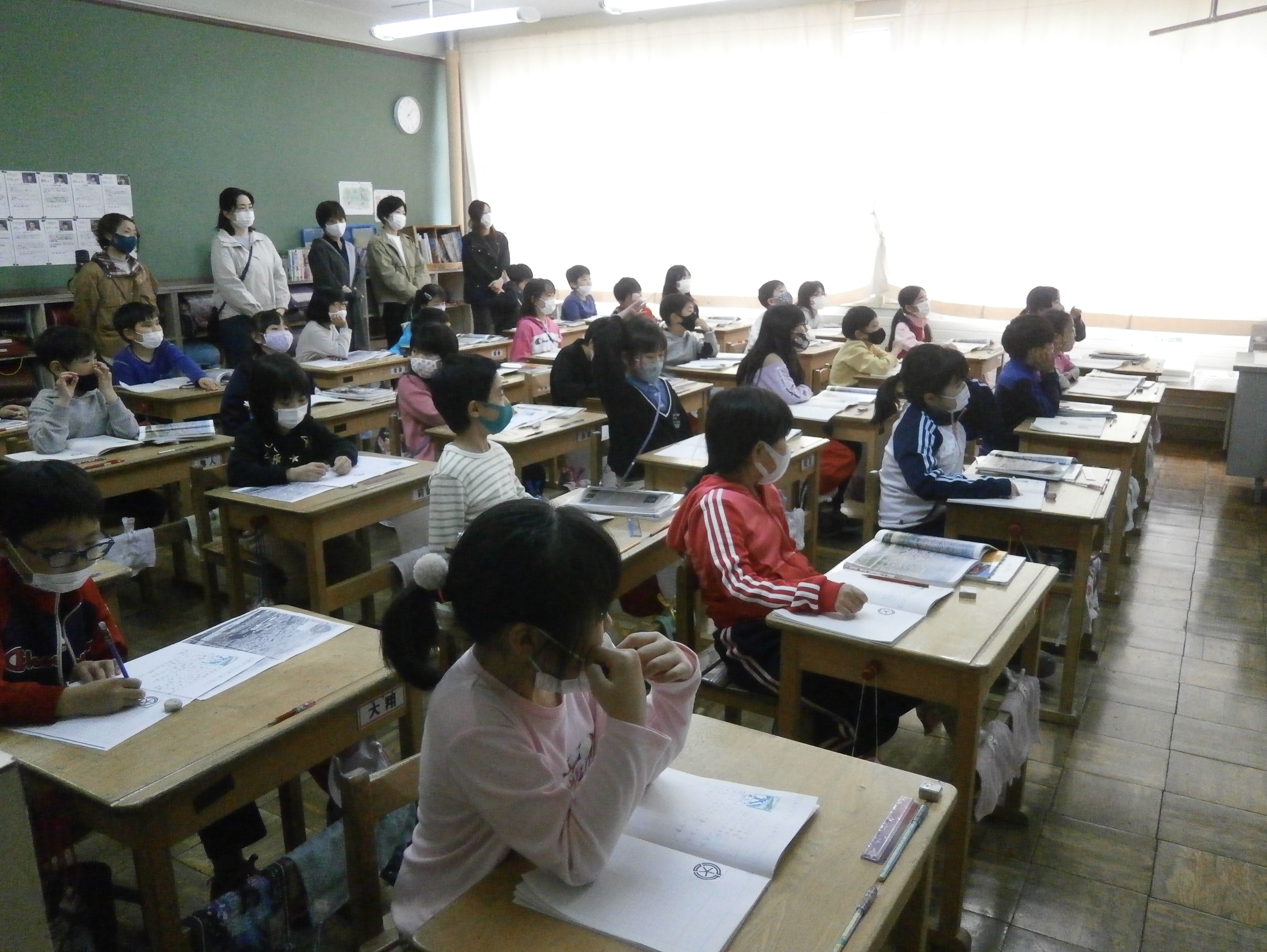 新型コロナウイルス感染症予防のため、今年度最初の授業参観もとなりの教室でのモニターによる参観と、実際に教室の中に入って見ていただく参観との時間交代で実施させていただきました。新しい学級、新しい担任の先生との学習を張り切ってがんばる子どもたちの姿をご覧いただけたのではないでしょうか。保護者の皆様には、消毒作業等のご協力いただき、誠にありがとうございました。