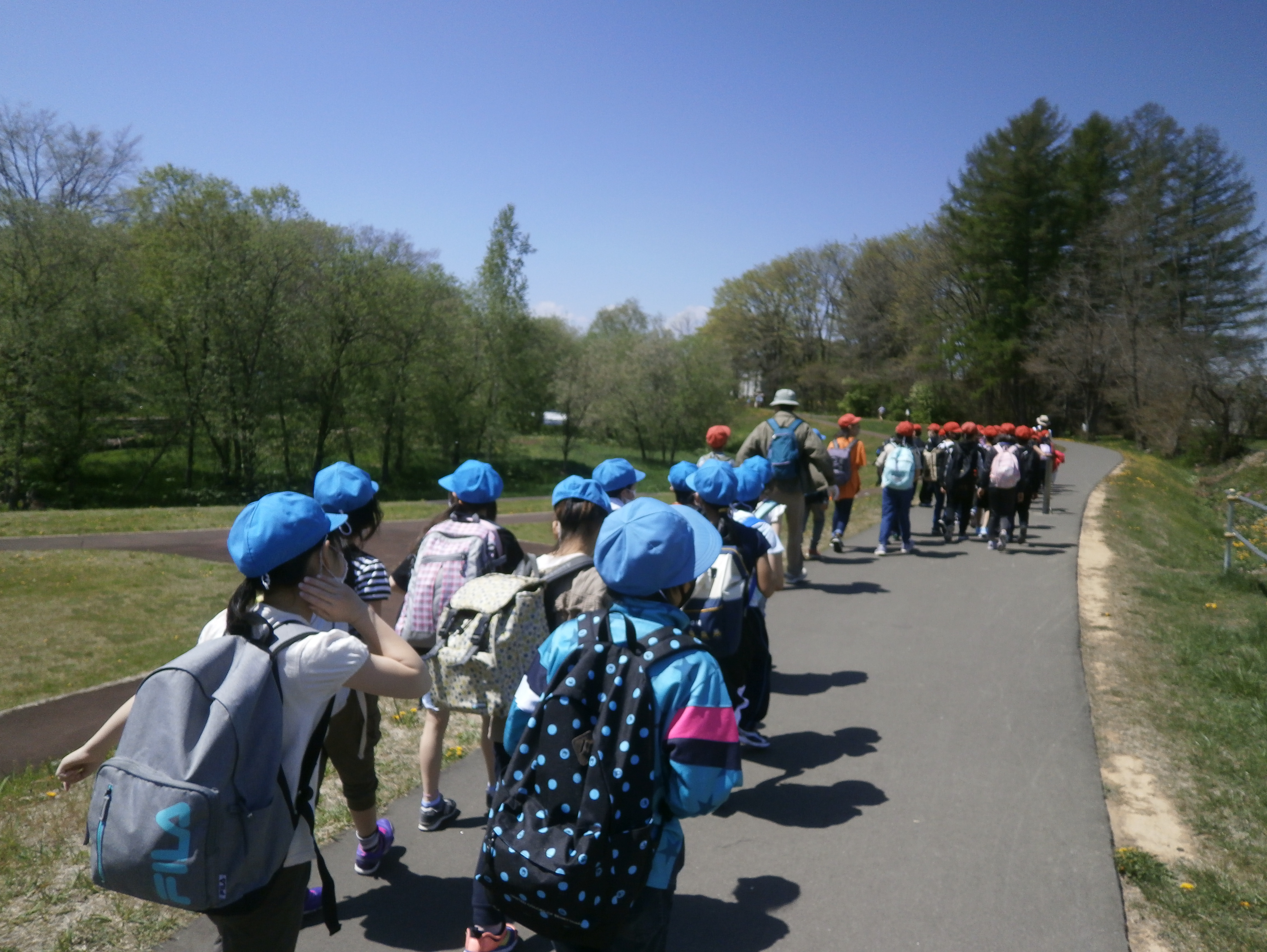 1年生は、グリーンパーク。2年生は、帯広動物園。3年生は、市役所などを経由して中央公園。4年生は、さけのふるさと公園。5年生は、白樺公園。6年生は、ウォークラリーをしながら競馬場へ行きました。