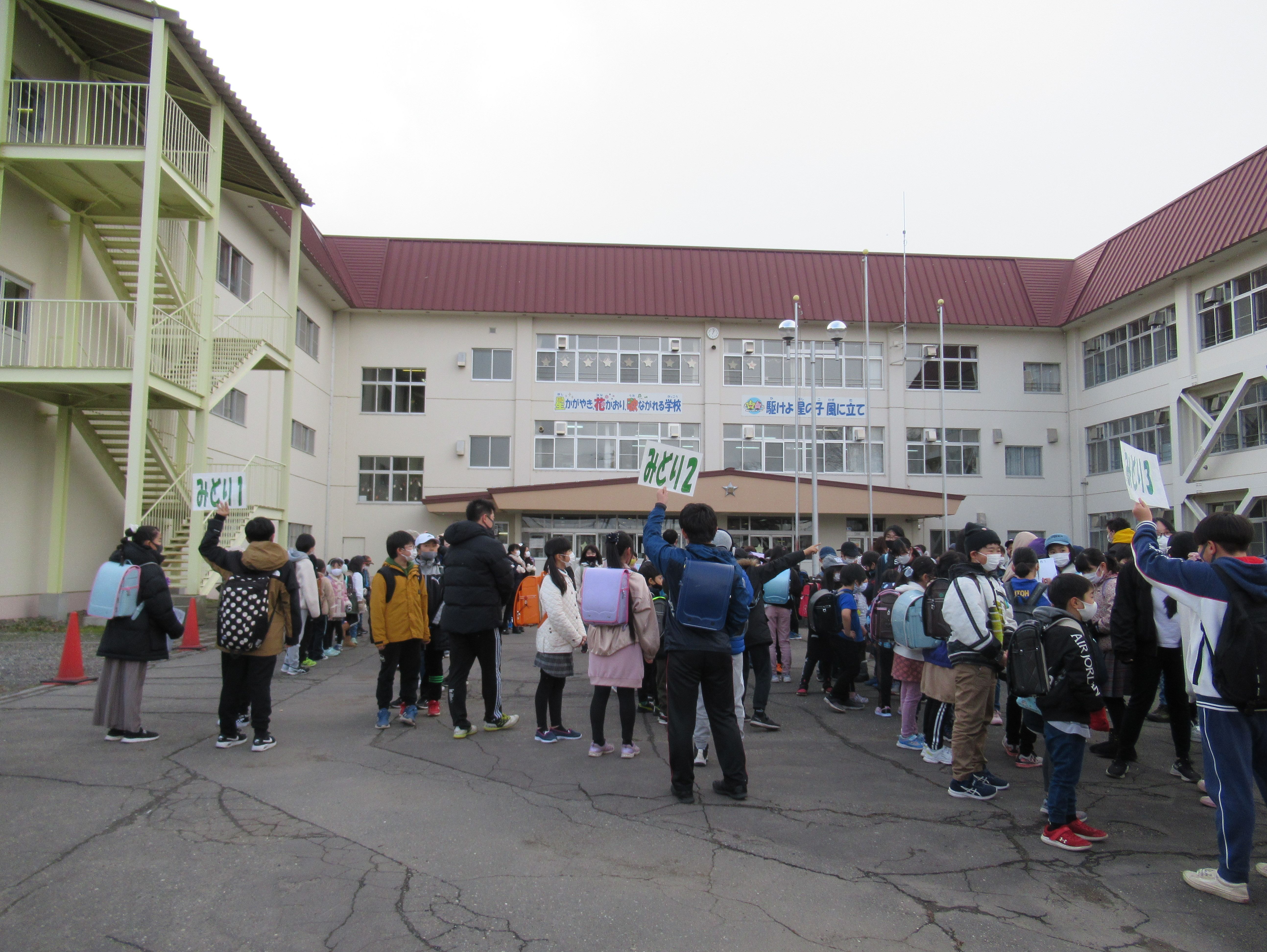 雪が舞う中、集団下校訓練が行われました。6年生が中心となり、各コースごとに整列や人数確認を行いました。最高学年として頼もしい姿を見ることができました。下校の際には、もしもの災害に備えて、緊張感をもちながら安全に下校することができました。